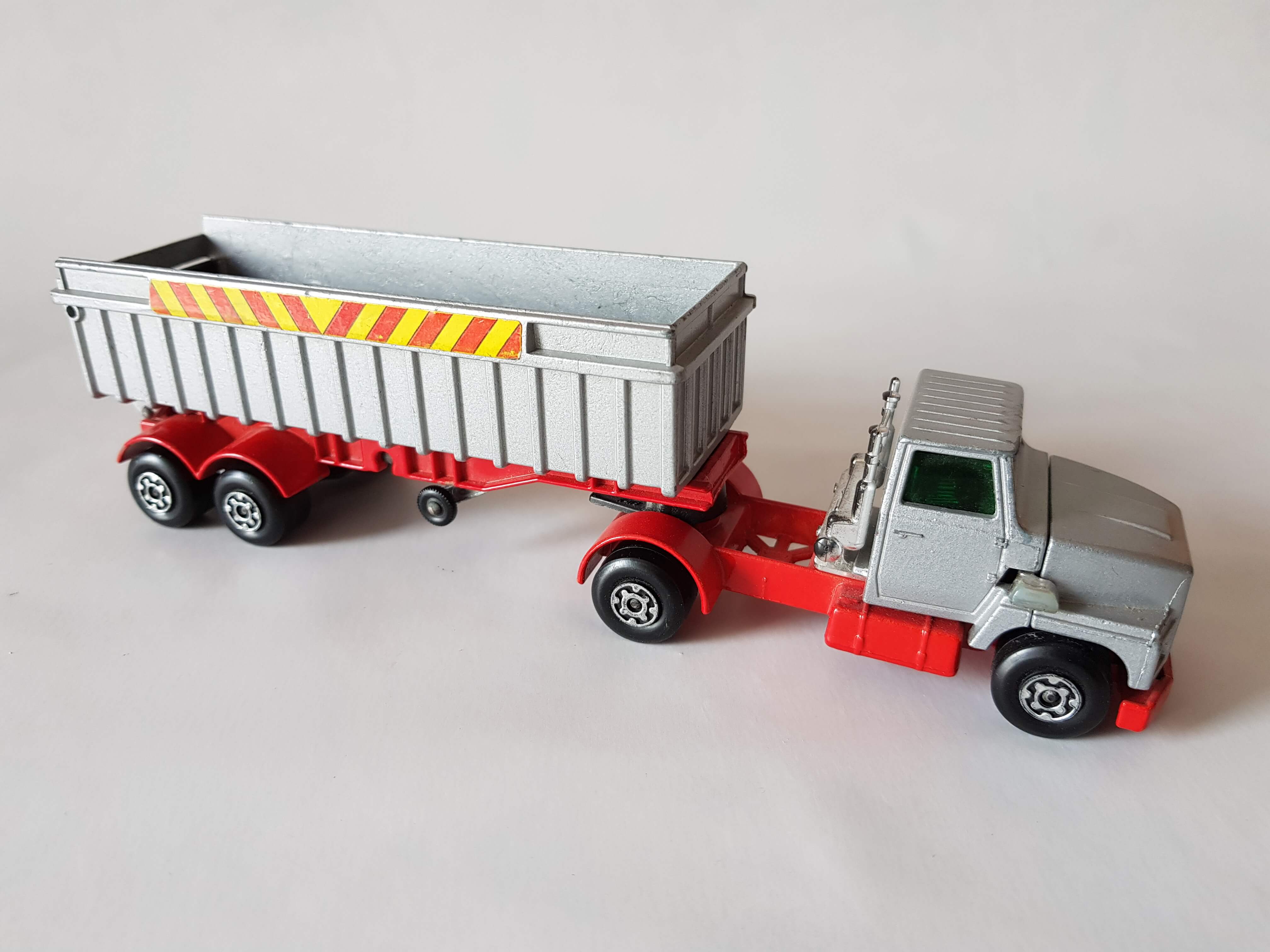 Model angličáku Matchbox Super Kings K-16/18 SILVER Ford LTS Articulated Tipper Truck, r.v.1973, stav 99%, ve sbírce.